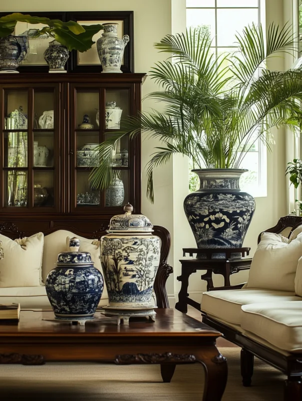 Furniture in this style often features dark hardwoods such as teak, chosen for durability in humid climates and admired for their deep tone. These substantial wooden pieces create contrast against light walls and breezy textiles.