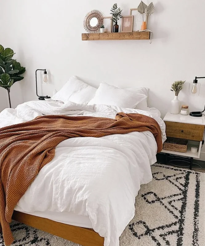 Focus on texture instead of quantity. Use linen bedding, wood furniture, woven storage, and keep surfaces simple.