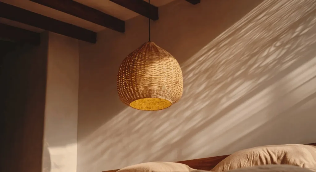 Woven pendant lighting changes how a bedroom feels once the light is switched on. The structure of the shade filters brightness in a way that spreads light gently across the space.