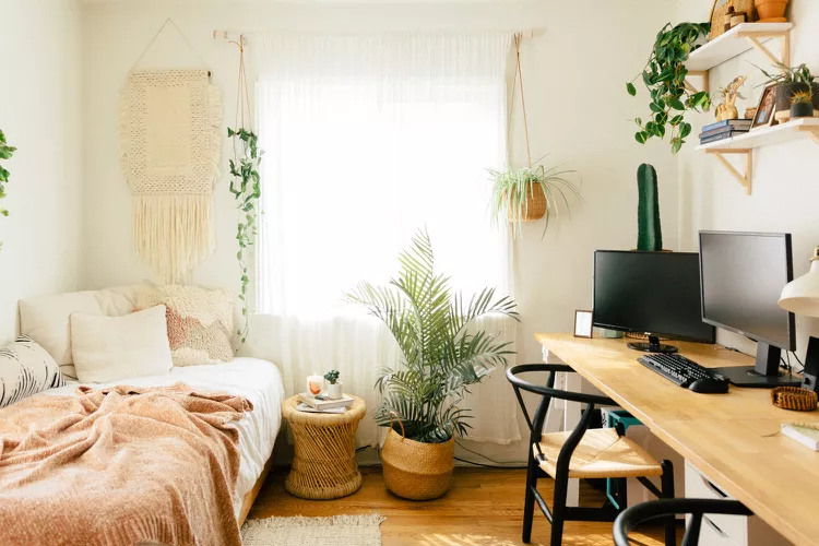 A pull-out sofa offers a practical solution for combining a guest room with an office. It allows the room to shift function based on need.