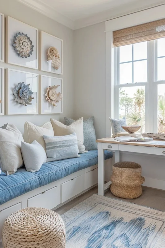 A coastal comfort guest room office combo brings in light tones and breezy textures. The space draws inspiration from seaside settings with a calm look.