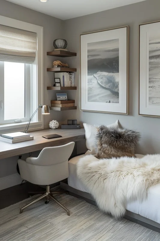 A contemporary cozy corner brings together modern lines with soft textures to create a balanced guest room office combo. The design focuses on comfort without losing structure.