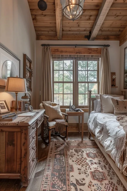 A rustic elegance room combines natural materials with refined details to create a balanced guest room office combo. Wood surfaces and soft fabrics shape the overall look.