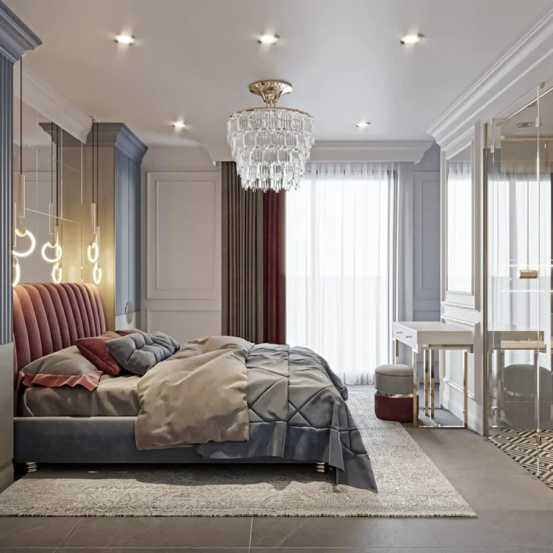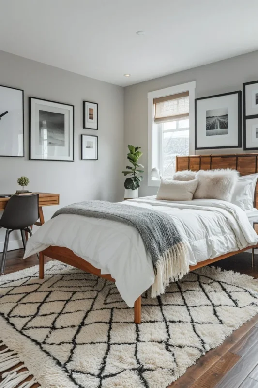 The bed area can include layered bedding in neutral tones. This keeps the space cohesive and comfortable.