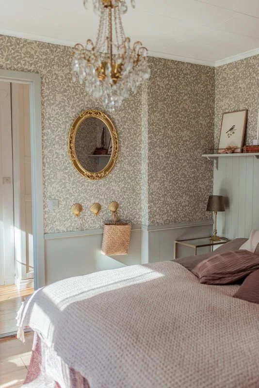 Botanical wallpaper brings pattern and life into a grandma core bedroom through nature-inspired prints. It introduces details at the end of the day.