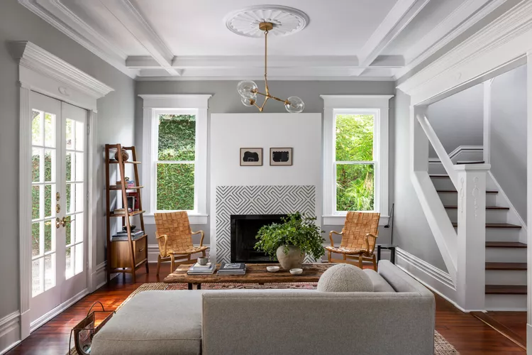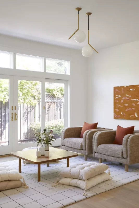 Rugs can also play a role here. A patterned or slightly colorful rug can anchor the seating area and connect the palette across the room.
