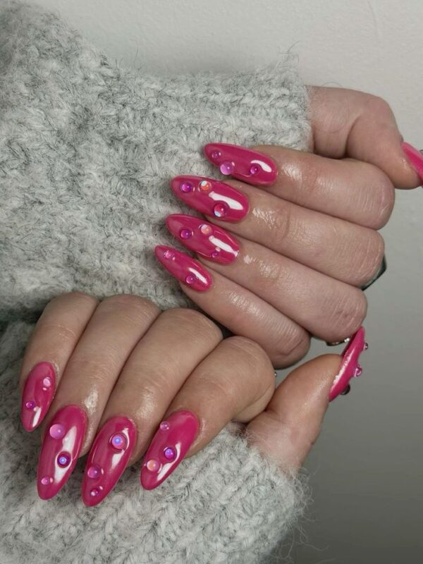 This bright hot pink almond set blends glossy shine with glitter plus swirling lines for a confident winter look.