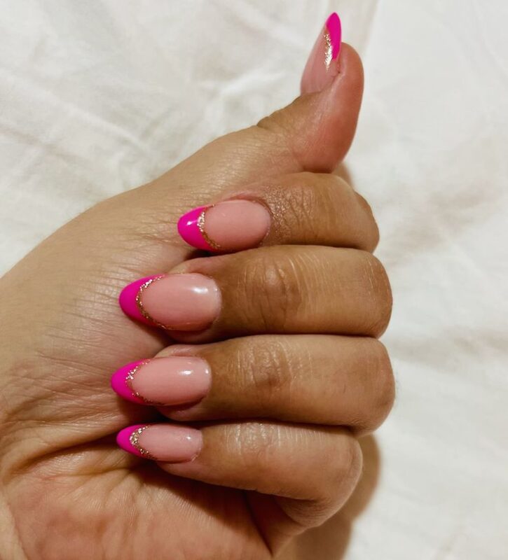 This updated French tip radiates confidence. A slim hot pink outline hugs the nail while a soft base keeps everything fresh. The result gives a glossy finish that feels clean with a touch of energy.