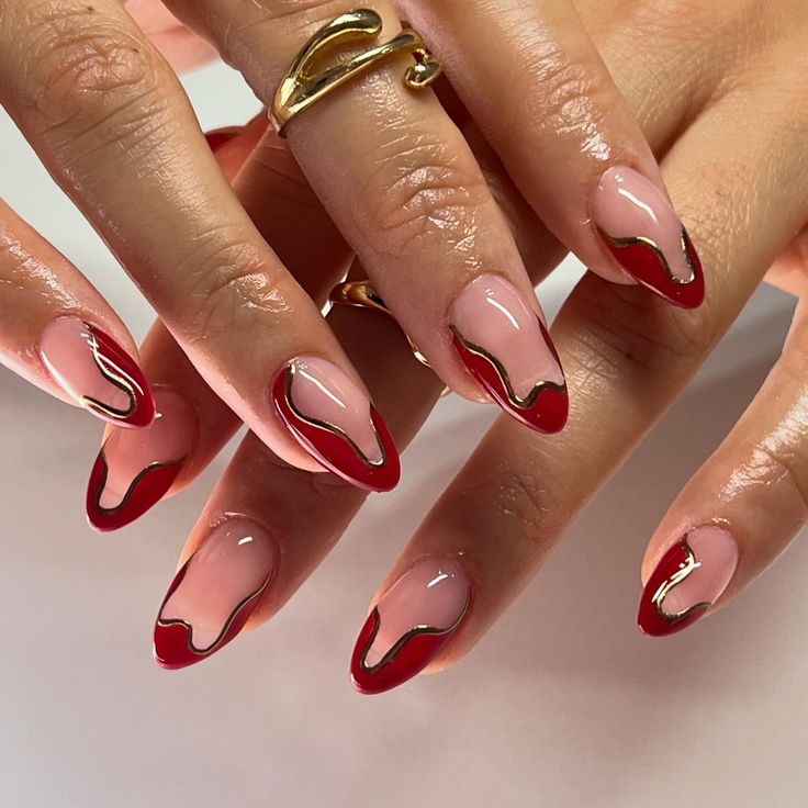 The red almond-shaped nails are adorned with small, off-center gold metal bows, making the design look more like jewelry than a simple nail decoration. It’s festive, and the gold adds a luxe vibe to the cherry cream base.