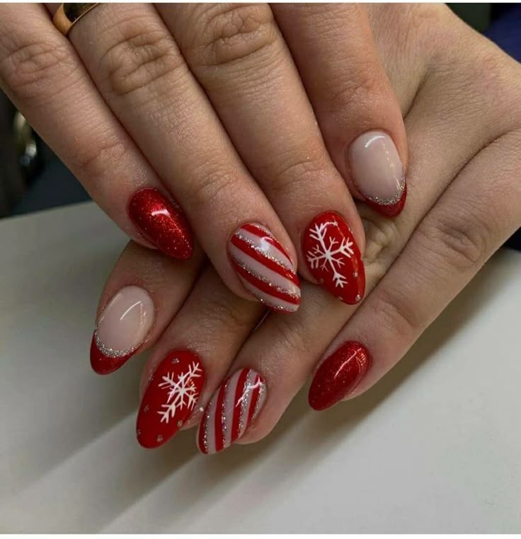 Almond-shaped nails naturally evoke a sense of elegance, and this design enhances that by pairing crystal-clear red with delicate white snowflakes.