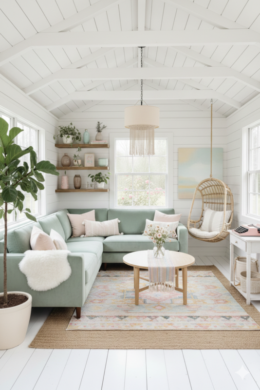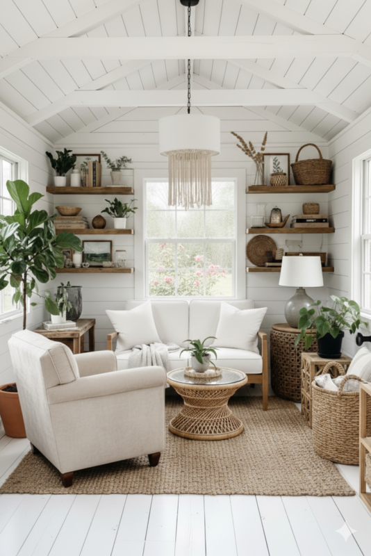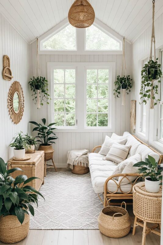 This chic boho she shed retreat draws you in with height. The vaulted ceiling rises above crisp white paneling that brightens every corner. Light that bounces across the walls gives your room an airy lift.