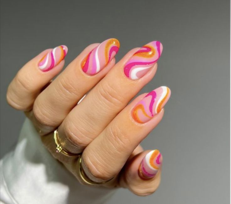This nail art allows you to express your creativity with random swirls that create a one-of-a-kind look. The combination of the vibrant pink and orange hues adds movement to your nails.