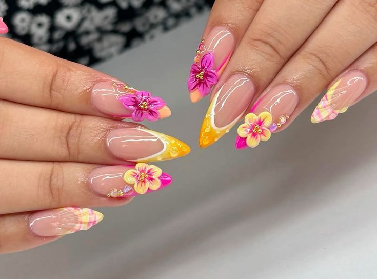 Floral accents on pink and orange nails offer a feminine touch. You can use orange flowers or pink petals over a soft base to create a charming design.