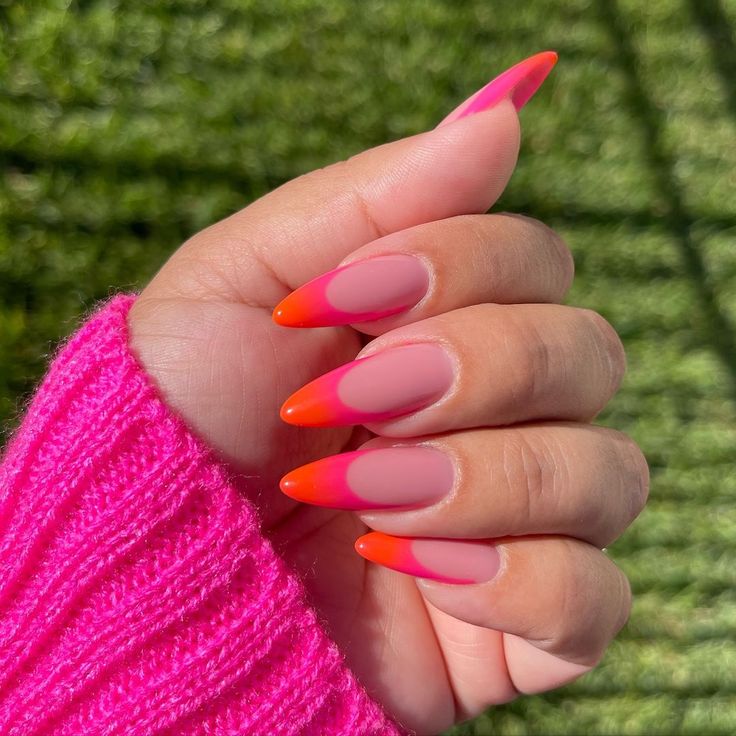 Sunset gradient nails blend pink and orange, transitioning from dark pink near the base to a bright orange at the tips.